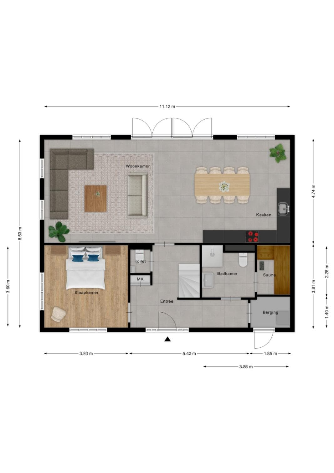 Bij binnenkomst in deze sfeervolle woning stap je in een ruime, lichte hal die direct een gevoel van comfort en kwaliteit uitstraalt. Vanuit hier heb je toegang tot een royale slaapkamer op de begane grond, een handige berging, en een luxe, rolstoelvriendelijke badkamer met inloopdouche, wastafel én een eigen sauna – ideaal om heerlijk te ontspannen. Ook vind je op de begane grond een separaat toilet en de trap naar boven.