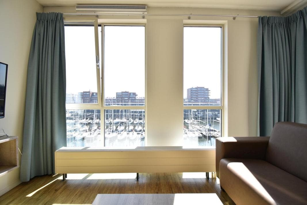 De woonkamer, met open keuken, is voorzien van grote raampartijen waardoor een grandioos uitzicht op de jachthaven is gegarandeerd.