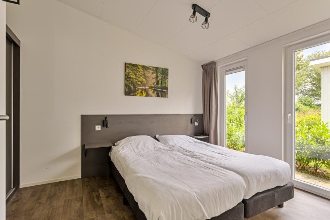 De lodge is voor 4 personen. De lodge is duurzaam en luxe afgewerkt. Bij de entree vind je het toilet en de badkamer met wastafelmeubel en regendouche. Aan beide zijden van de badkamer zijn de slaapkamers gesitueerd, één met 2 bedden tegen elkaar en een schuifkast. De tweede slaapkamer heeft losse bedden en slimme wandkastjes.